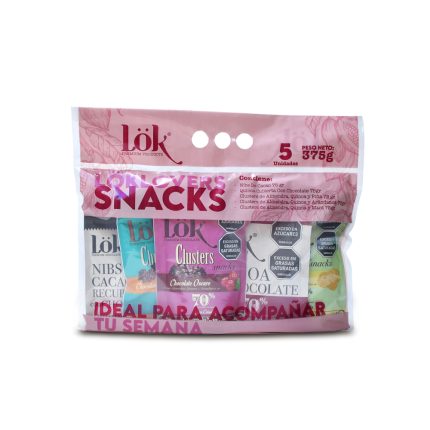 KIT LOK LOVERS contiene 5 snacks , ideales para acompañar tu semana y compartir con los que más quieres. En cada pack vas a encontrar Nibs de Cacao 75 gr, Quinoa Cubierta Con Chocolate 75 gr, Clusters de almendra, Quinoa y Piña 75 gr, Clusters de Almendra, Quinoa y Arándanos 75 gr, Clusters de Almendra, Quinoa y Maní 75 gr.