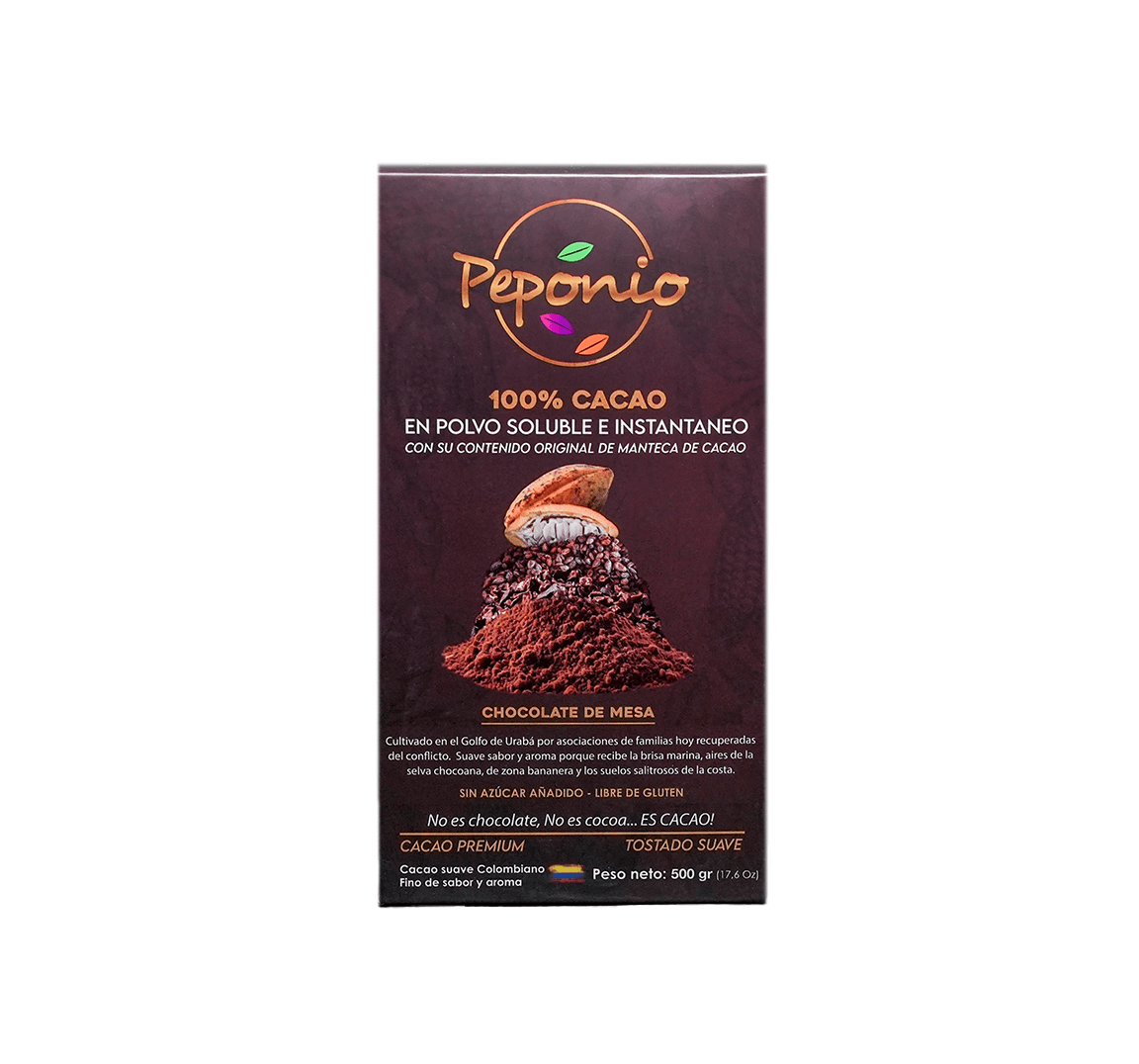 Disfruta el nuevo PEPONIO 100% Cacao – En Polvo Soluble e Instantáneo. Calidad premium, Con su contenido original de manteca de cacao (Cacao Butter) donde residen todas sus propiedades.